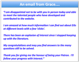 This translational depiction of Grace's research impacts was shown at the D3G website launch function in 2013. Later seeing this slide, Grace wrote "I have never seen my research career put into such clear categories. It does look impressive and so I maybe deserve to be your patron. I had to go and have a cup of coffee and think about it. I would like to help in anyway I can and agree with your outlook."